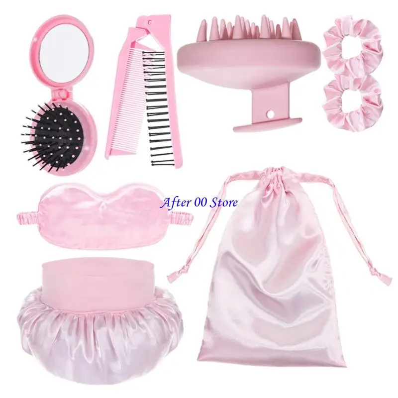 Everything you need for perfect hair care in one set! This 8-piece collection includes bonnets, curling caps, comb, and brush - your complete solution for protecting and styling hair overnight.